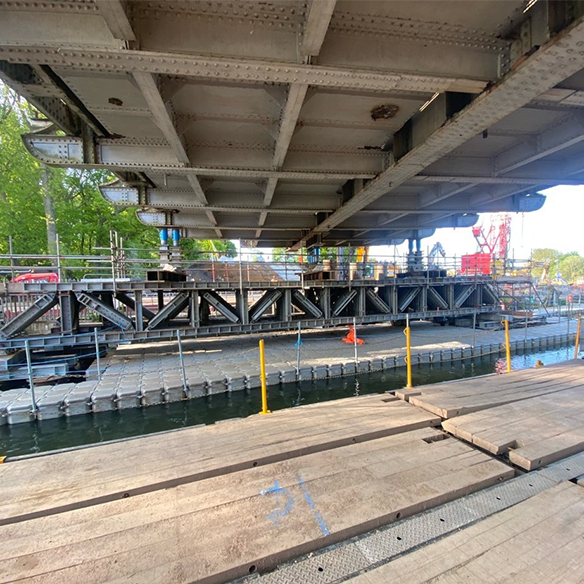 The scheme was formed of our Mass 25 grillage beams connected together to form a 22m long truss with Mass 50 and Mass 25 vertical and diagonal components. On top of the two trusses, three jacking platforms were installed, using bespoke beams to enable a jack and pack operation.