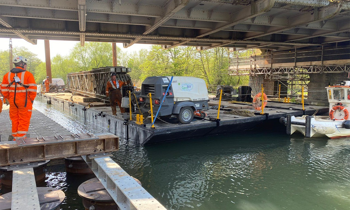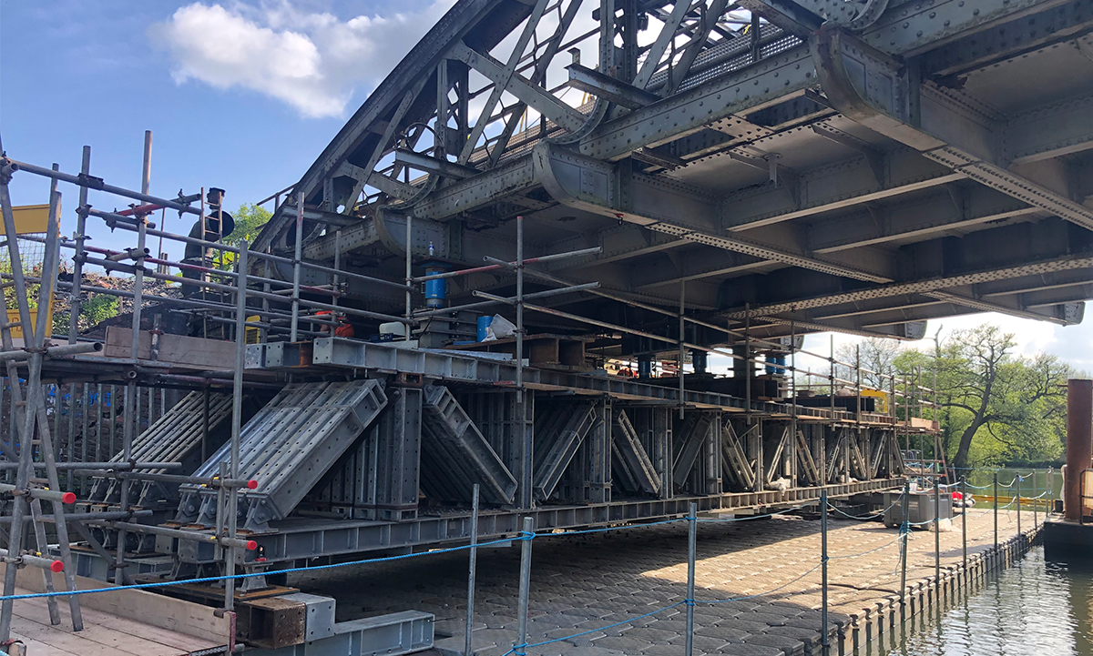 Colin Campbell, Senior Engineer at Mabey Hire explained: “Working closely with Network Rail and Balfour Beatty  engineering teams, we designed a bespoke propping  and jacking scheme. The end solution had to allow us to  span 20 metres off piles driven into the River Thames and  have a jacking arrangement on top, enabling us to lift the 200-tonne bridge structure up by 650mm to its original level.”