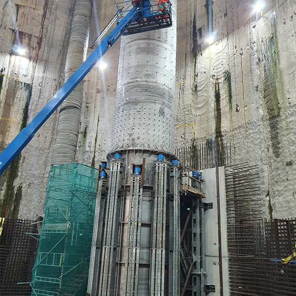We designed and supplied a propping system to securely support and accurately position the vortex tube while the secondary shaft lining was cast, providing a faster and more efficient alternative to traditional concrete plinths.