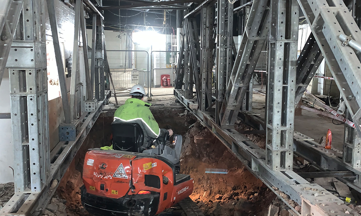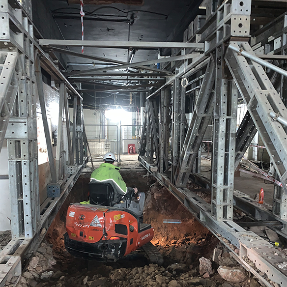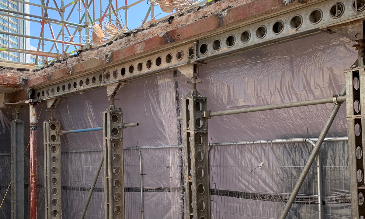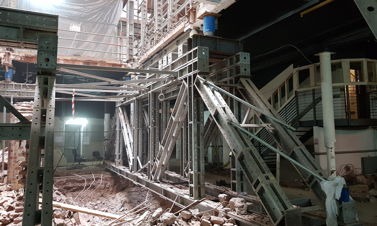 This resulted in our team designing, fabricating and installing 20 tonnes of support steelwork – featuring Mass 50 propping units, together with specially strengthened 12.5-metre-long transfer beams and stools, to bridge the foundation works. Special fabrications were required to not only provide the 50 tonne capacities, but to also ensure the components could be manually assembled, while a winch was used to lower everything through the void in the ground floor slab.
