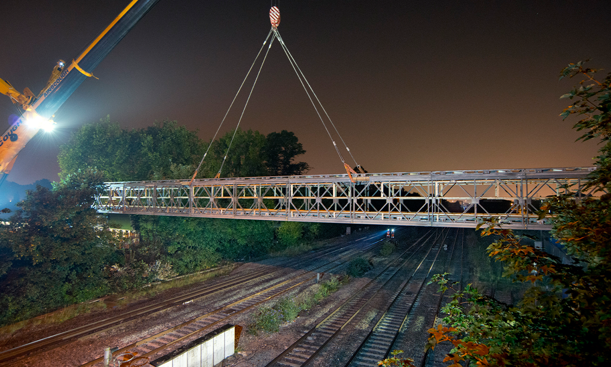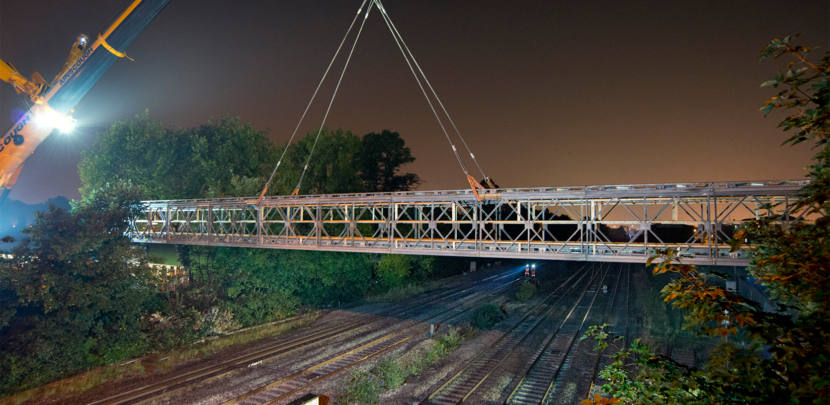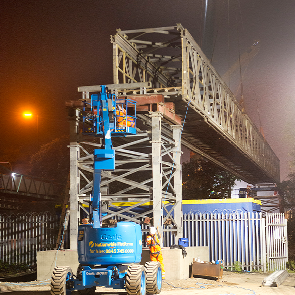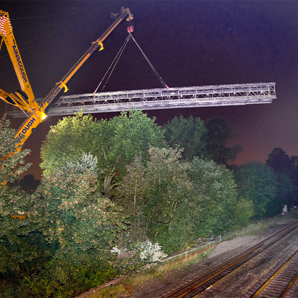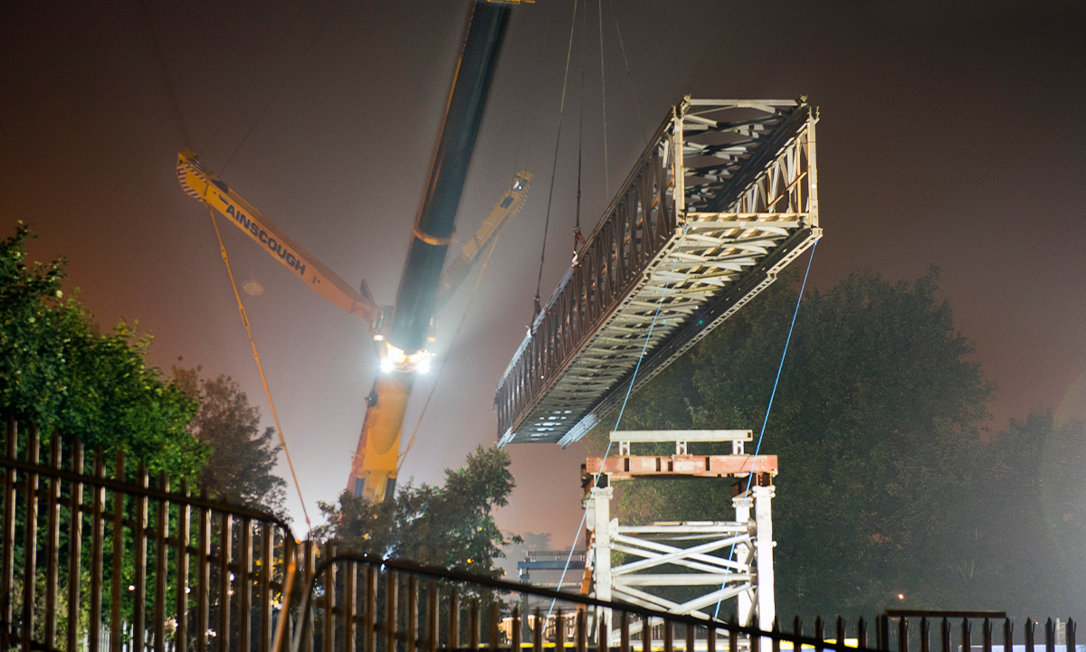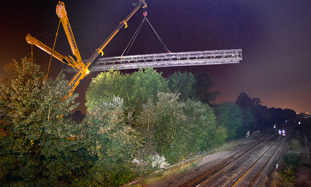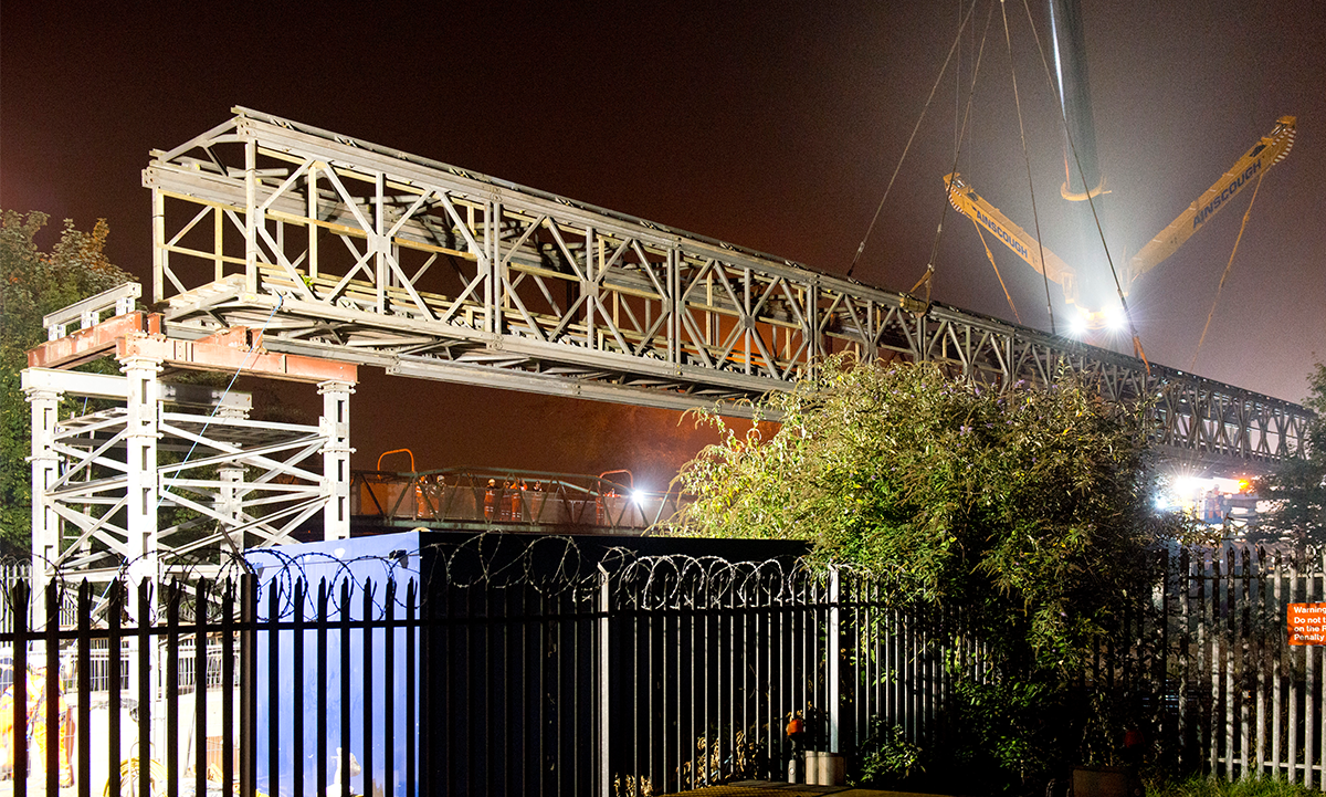 A large 750Te capacity crane was successfully used to lift the bridge into position over the 4 track section of the line with less than 3 hours in which to lift it into position. Stiffness of the structure was critical and had to be kept to a minimum due to the delicate nature of the multiple services that are carried on the structure and their limited clearance over the railway deflections.