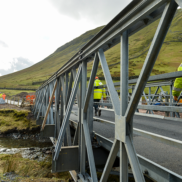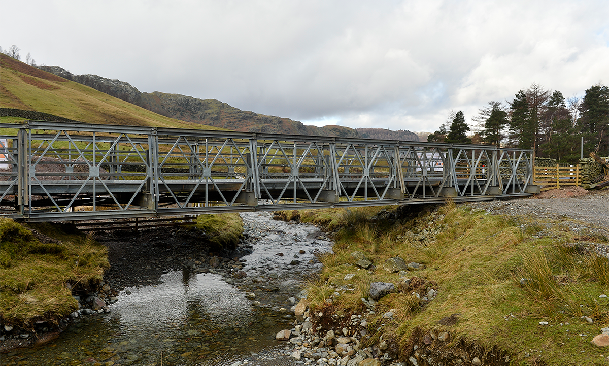Working with Thomas Armstrong Group, we installed a 24 metre span Compact 200 vehicle bridge and a 12 metre span BeamBridge on the route turning the rough track into an essential link for both the school and shuttle bus services. The A591 was fully reopened five months later.